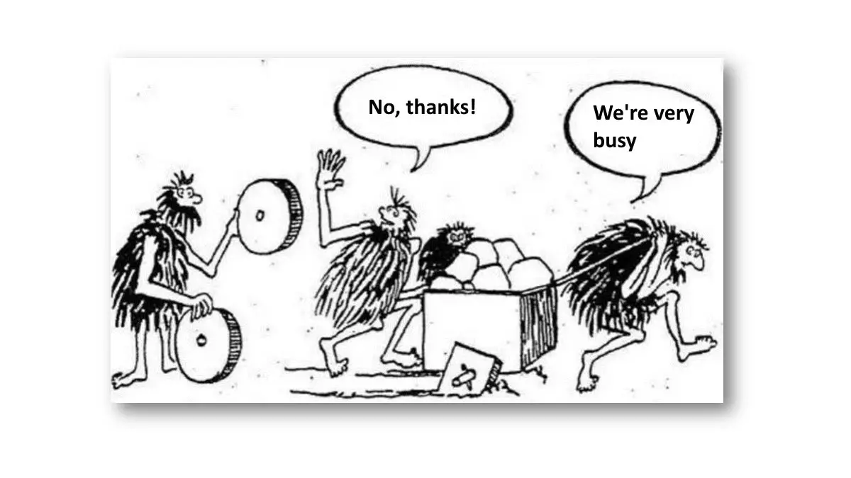 I’ve just got off the phone and that humorous cartoon of a couple of Cro-Magnons sweating and pushing a trolley with square wheels stuck in the ground while saying to another one standing next to them with round wheels in his hand something like “No, thanks! We’re very busy”.